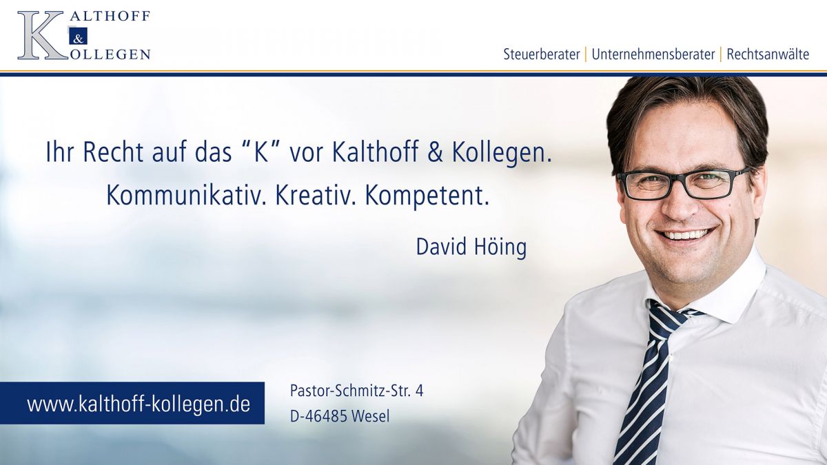 Wir, die wir bei Kalthoff & Kollegen arbeiten, wissen das. Wir haben aber auch verstanden, dass wir Ihre individuellen Zielsetzungen nur mit Ihnen gemeinsam erreichen. Deshalb ist unser Selbstverständnis von einer partnerschaftlichen Zusammenarbeit geprägt von der freundschaftlichen Beziehung zu unseren Mandanten und Mitarbeitern, in der vorrangig Tugenden wie Vertrauen, respektvolles Miteinander, Offenheit und Verlässlichkeit zählen und offen gelebt werden.