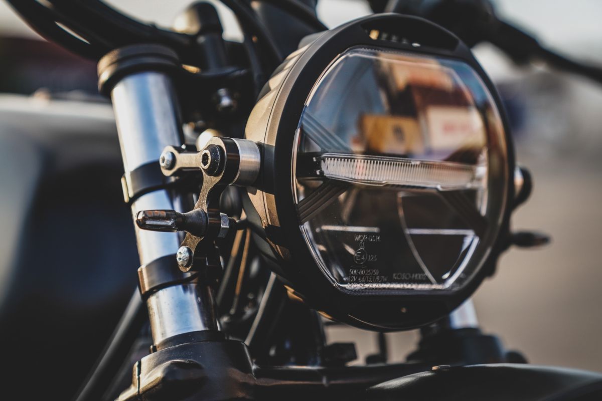 stock Roundels are a set of black and white badges. The steel frame, swing-arm, and engine were also painted black, as were the stock rims which are now wrapped in knobby Continental TKC 80’s.