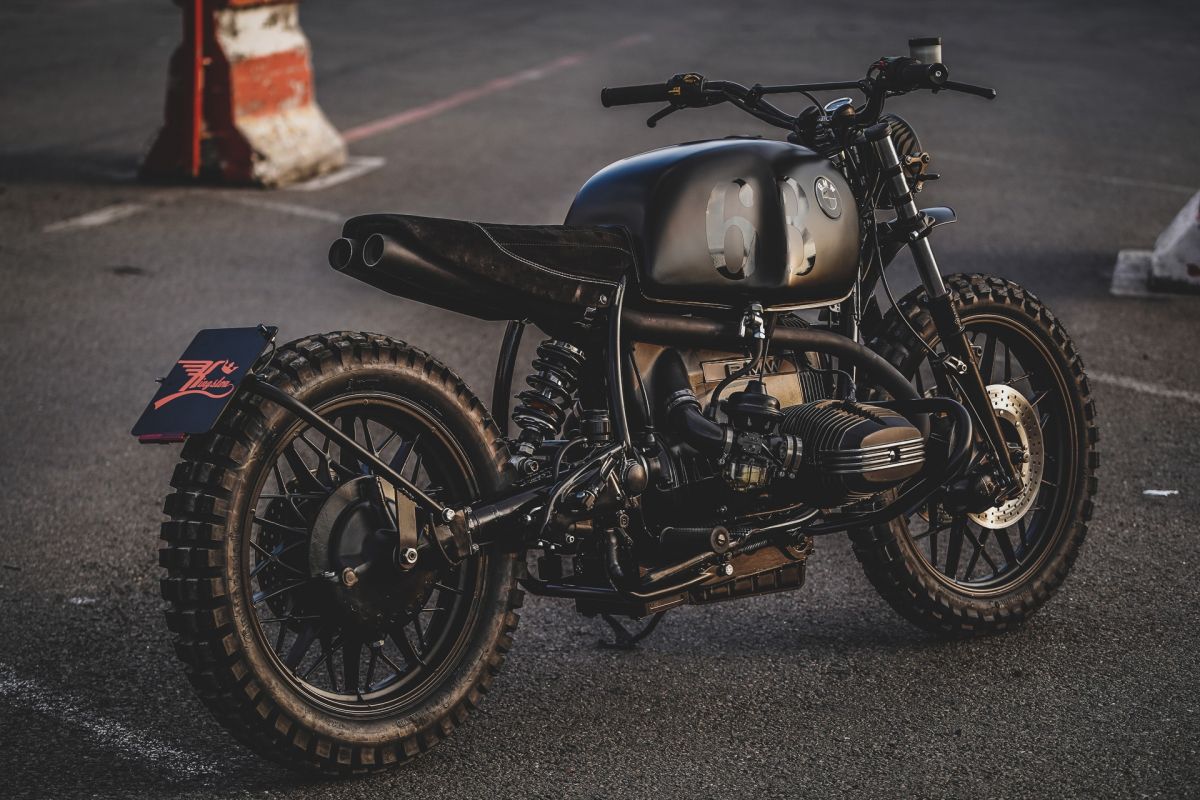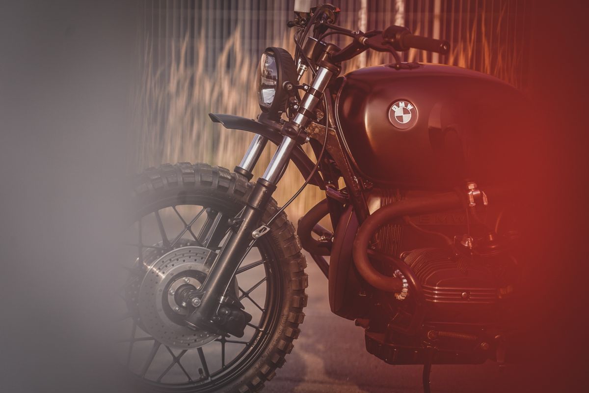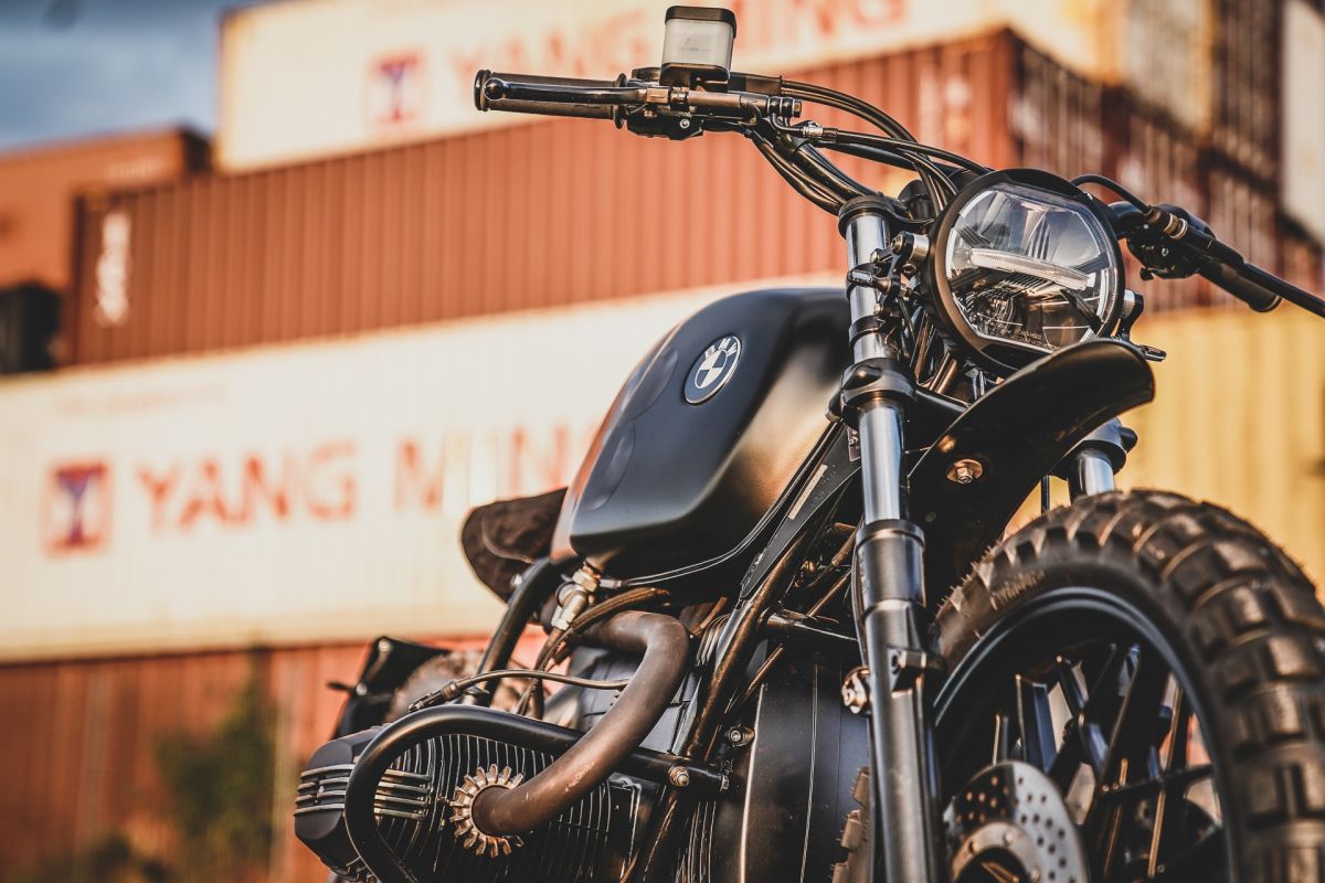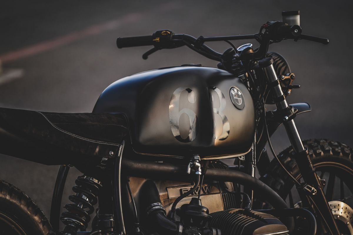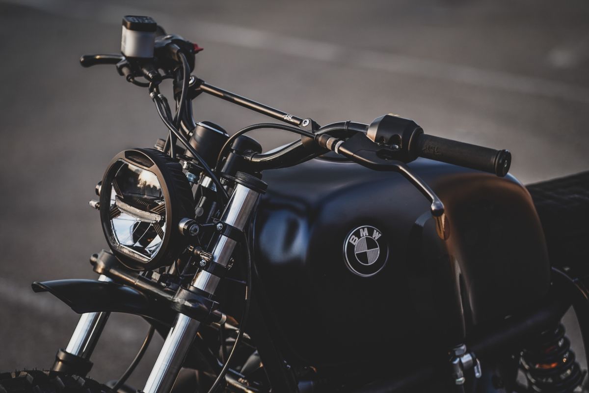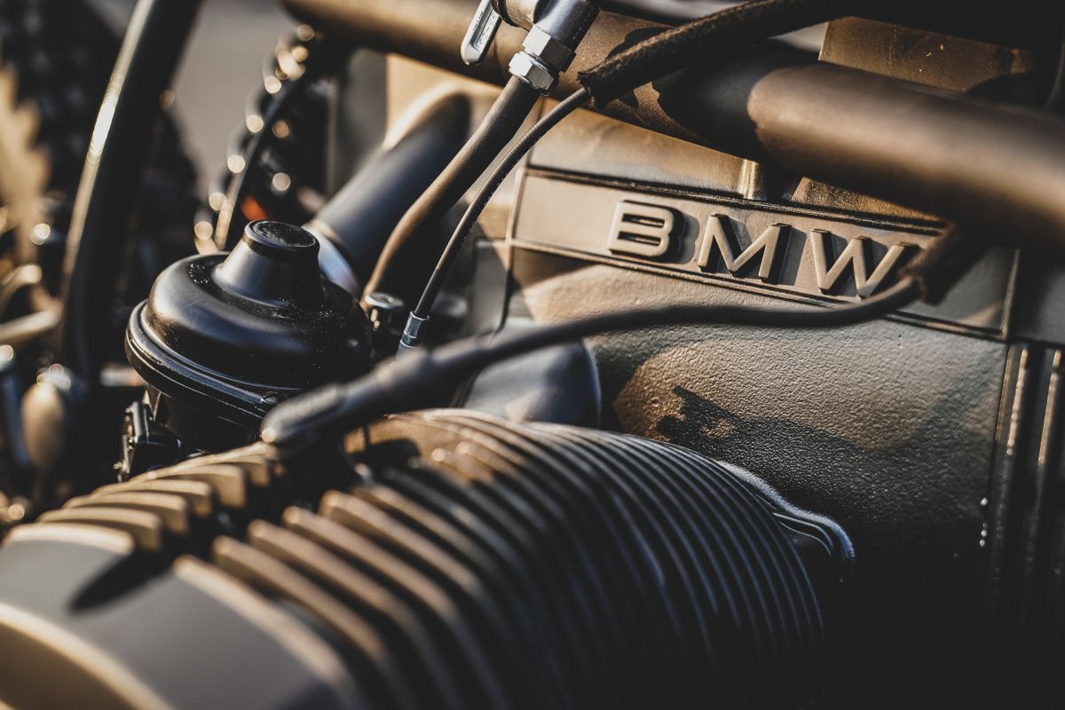 The BMW’s stock suspension has also been heavily reworked. Out front, the factory fork’s been shortened by 50mm. The RS’s stock swing-arm was swapped out for a unit off an R65, which was then stretched and