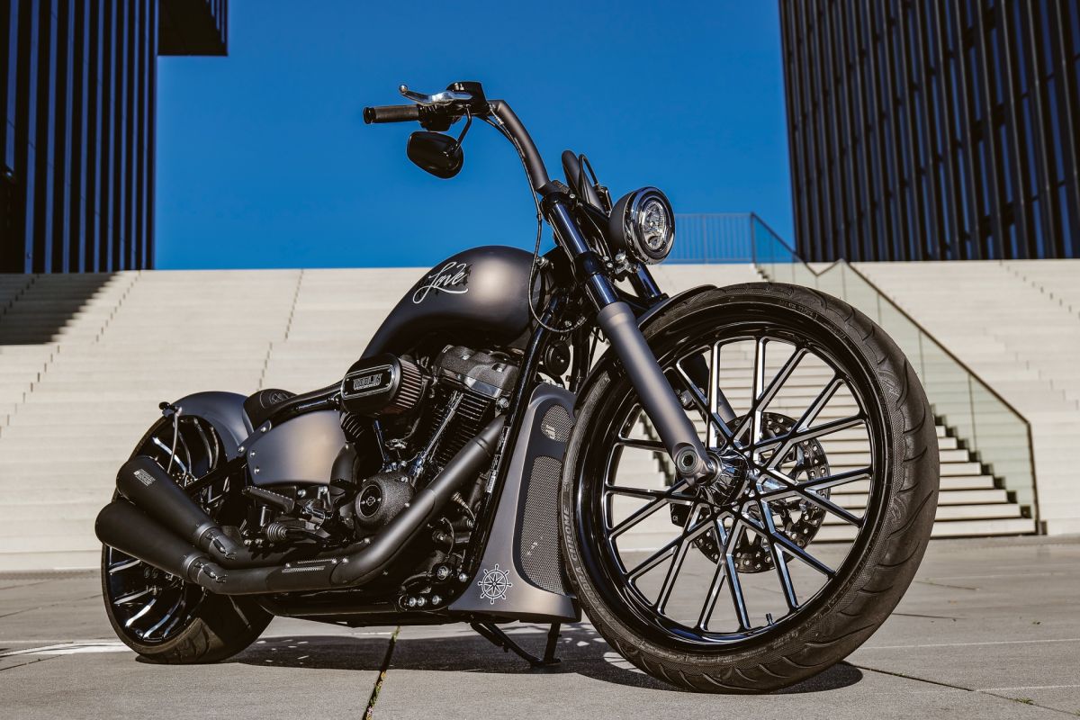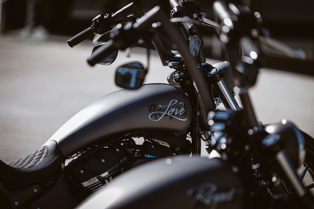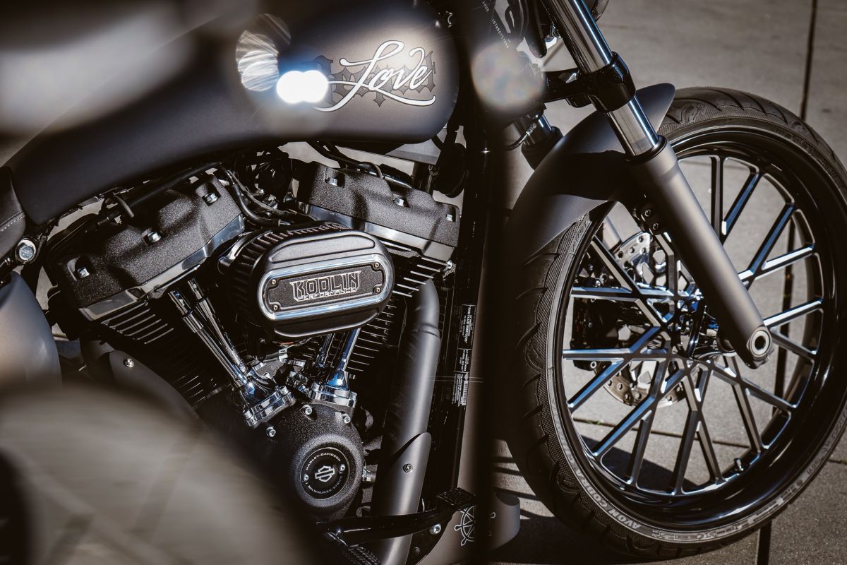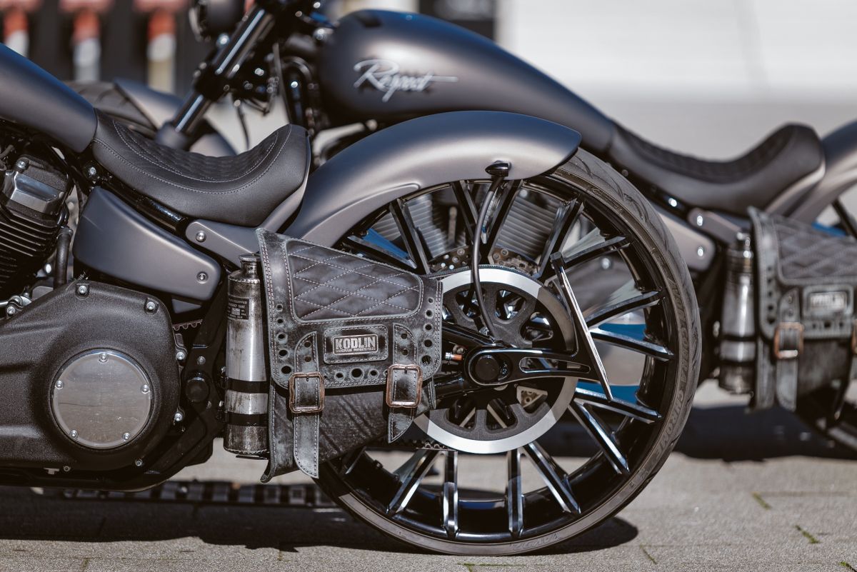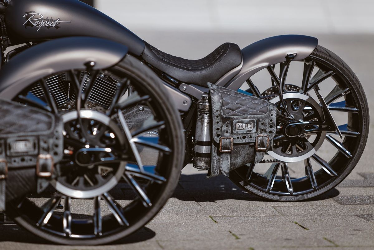 “Love and Respect” are the name of these Street Bob custom bikes, that you would consider to be identical twins. There are some significant differences you will notice when looking closer at the bikes. “Respect” was treated with a serious engine upgrade. The Kodlin S&S 124” big bore monster they have been using on a lot of their builds. You can’t go wrong with engine displacement manufactured by the industries performance leader, finessed at the Kodlin Performance Center in Borken, Germany. “Respect” also features a rear air-ride suspension, the ultimate mark in combining look and riding quality, forward controls and a high Kodlin Flowbar.