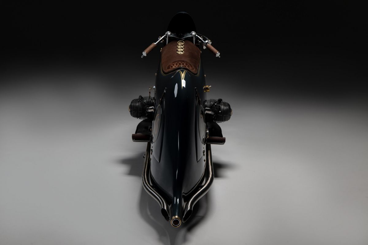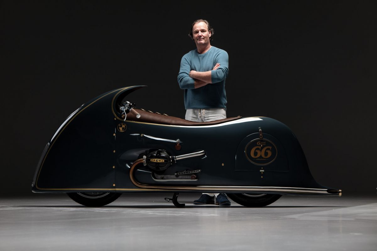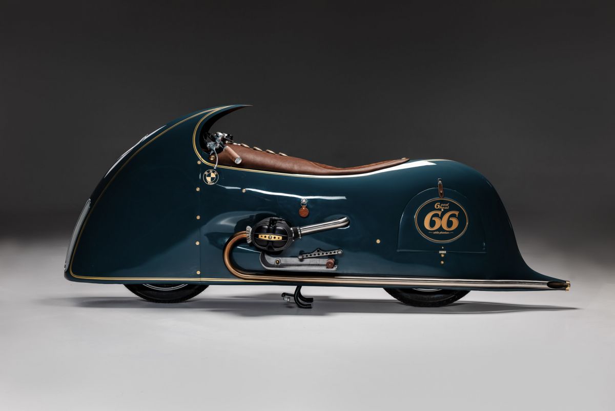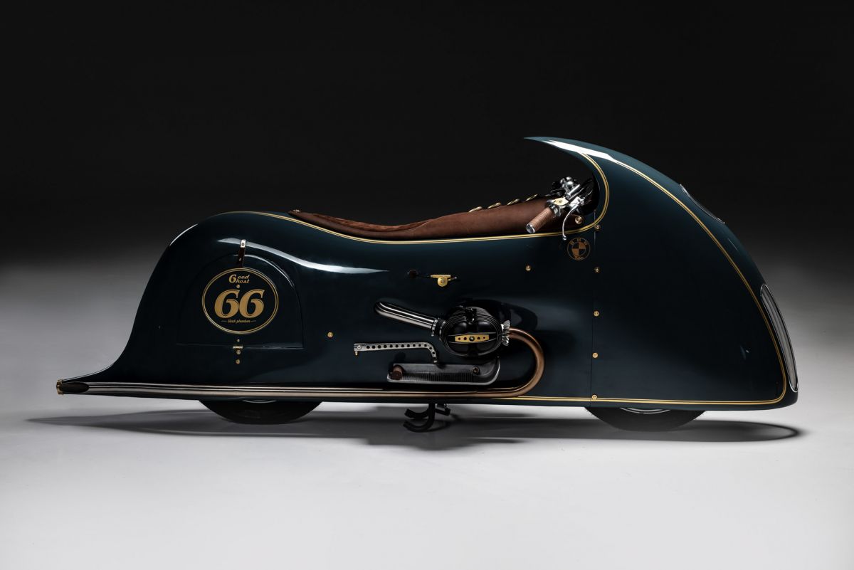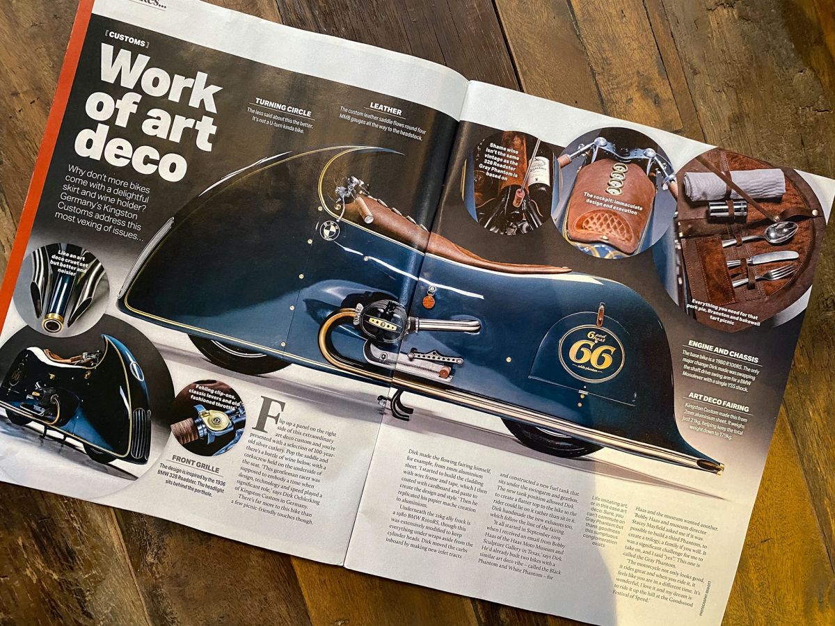 Ich begann, mit Drahtgestell und Tape eine Verkleidung zu bauen, die habe ich dann mit Pappe und Kleister beschichtet, so entstand ich Design und Style.Ich wollte nicht hinter einer Verkleidung im Motorrad sitzen sondern auf dem Motorrad reiten. Unter der Verkleidung habe ich eine Originale BMW R100RS versteckt, Rahmen und Technik alles Original, ich habe nur einen Monolever Dämpfer verbaut. Die Vergaser habe ich wie beim White und Black Phantom hinter der Verkleidung platziert Kingston Hand Made. Den Fuel Tank baute ich aus 2 mm Aluminium und setzte ihnunter Schwinge und Getriebe. Die Verkleidung ist komplett aus 2mm Aluminium und